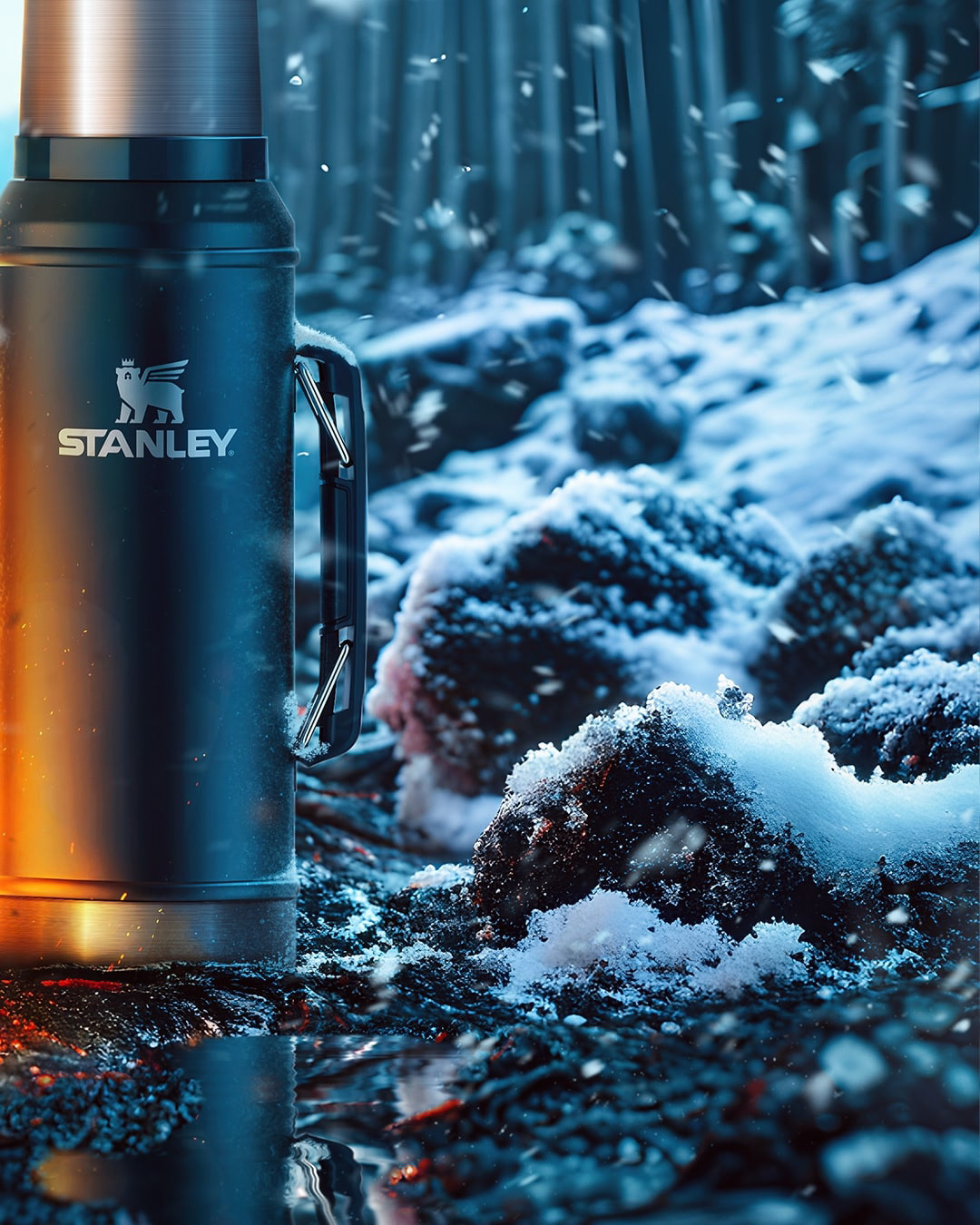 Some of the manual placements created in this image are colorgrading, snow, ashes, reflection of the bottle in the water, fire and all the atmospheric characteristics of the image to give immersion and depth.